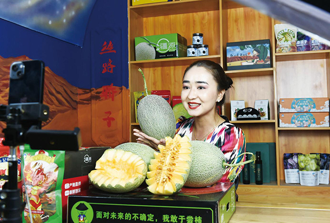图为主播在吐鲁番市红石榴电商直播孵化基地推销哈密瓜。