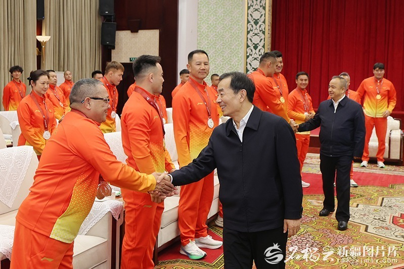 12月4日,自治区党委书记陈小江、自治区主席艾尔肯·吐尼亚孜同载誉归来的第十五届全国运动会新疆体育代表团获奖运动员、教练员代表亲切交谈,代表自治区党委和政府向他们表示热烈祝贺。石榴云/新疆日报记者崔志坚摄