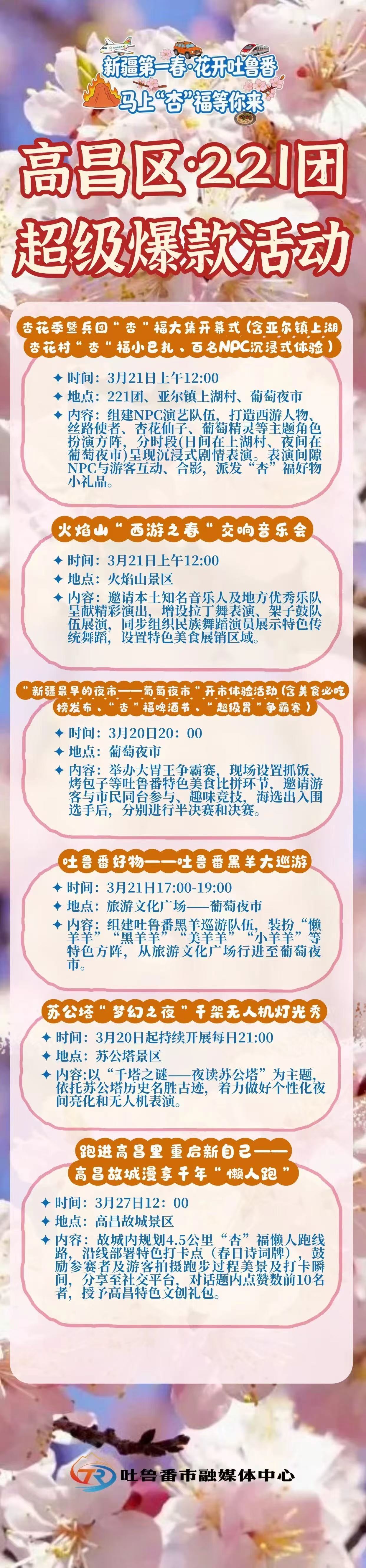 春风吹暖吐鲁番,2026吐鲁番杏花季将于3月20日正式启幕。沉浸式NPC演艺、火焰山交响音乐会、葡萄夜市开市、黑羊大巡游、苏公塔无人机灯光秀……超多爆款活动轮番上演!交通、停车、美食、住宿全攻略已备好,让你轻松奔赴这场春日之约~这个春天,来吐鲁番,马上“杏”福!