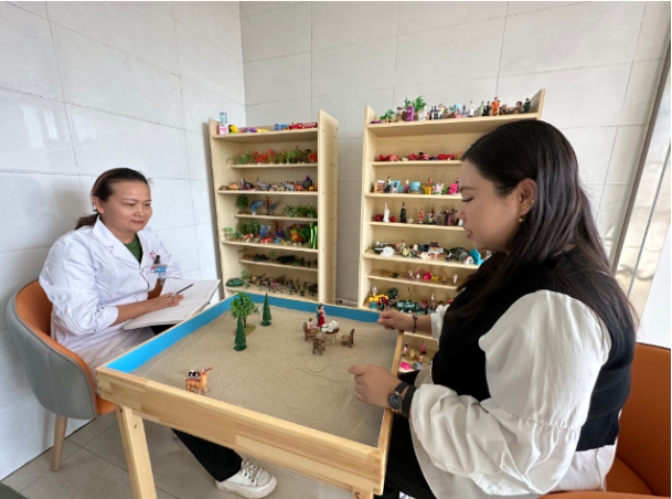 10月10日,在高昌区妇幼保健计划生育服务中心沙盘游戏室里孕妇在心理咨询。