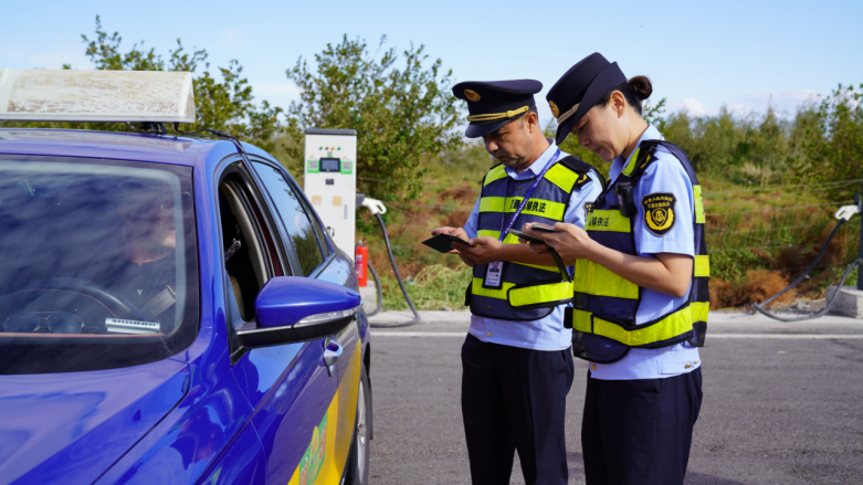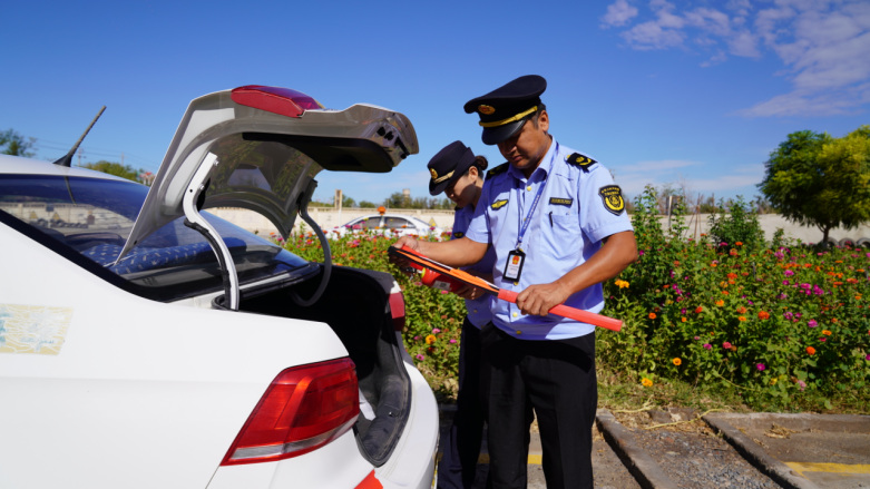 执法人员在检查车辆后备箱。