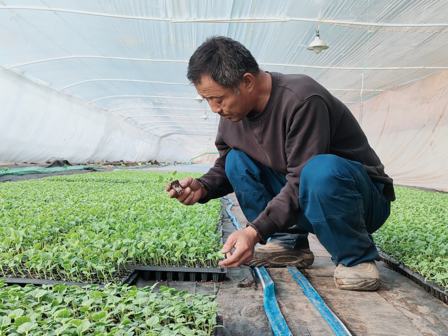 吐鲁番市果藤种植农民专业合作社技术员吕兴波正在悉心照料棚内的羊角蜜苗。吐鲁番市融媒体中心记者加帕尔摄