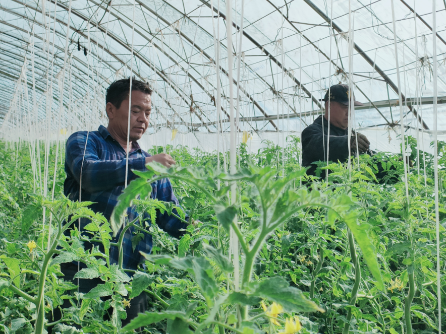 在鄯善县吐峪沟乡洋海湾社区的温室大棚里,工人正在对西红柿进行田间管理。吐鲁番市融媒体中心记者加帕尔摄