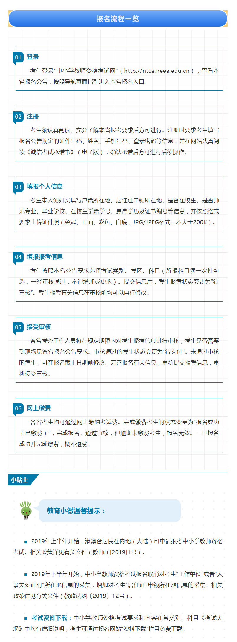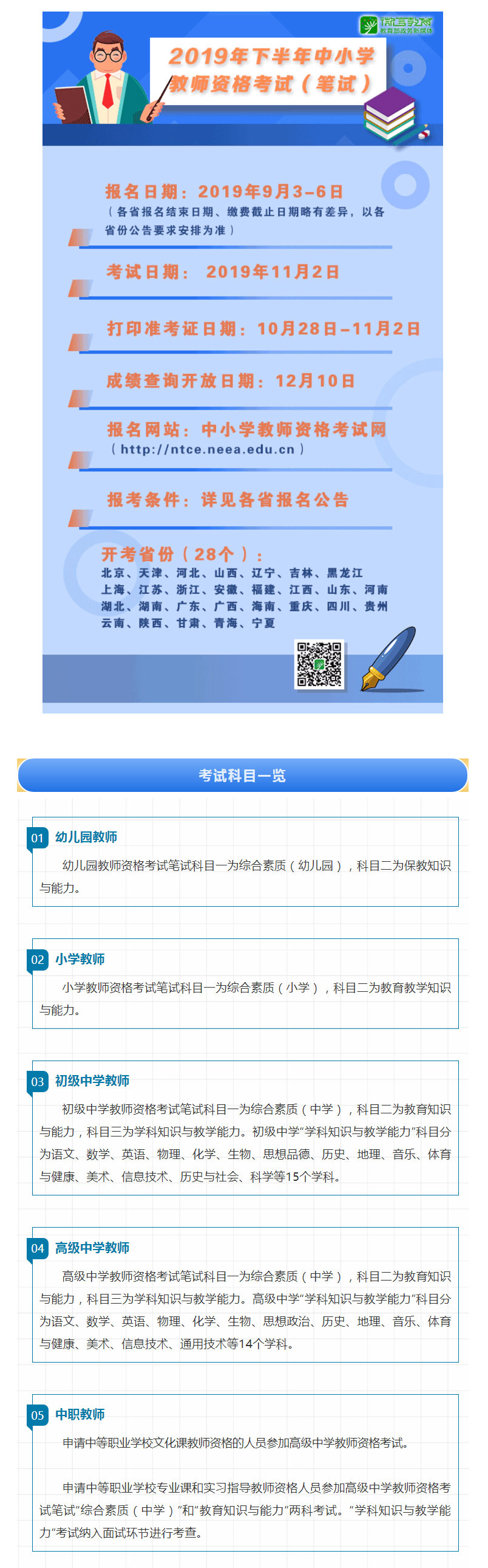 2019年下半年教师资格考试(笔试)日期定于11月2日,本次考试报名日期自9月3日开始。教育小微温馨提示:2019年下半年开始,中小学教师资格考试报名取消对考生“工作单位”或者“人事关系证明”所在地信息的采集,增加对考生“居住证”申领所在地信息的采集。该如何报名?有哪些考试科目?