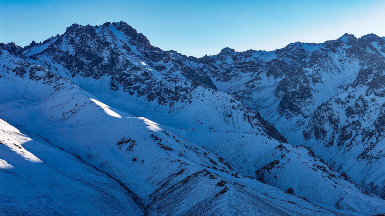 起伏的丘陵和雪山构成一幅冬日画卷。
