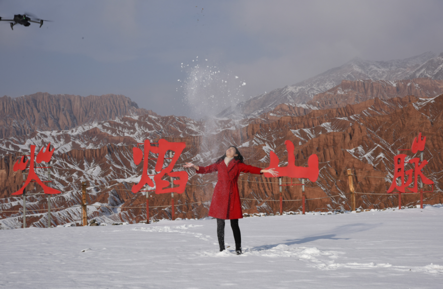 12月25日,在吐鲁番火云谷景区,游客在拍摄欣赏火焰山银装素裹的美景。火焰山横卧于吐鲁番盆地,盛夏酷热似火,冬季披上“银装”的火焰山分外妖娆,景色迷人。吐鲁番市融媒体中心记者刘健刘宇杰摄
