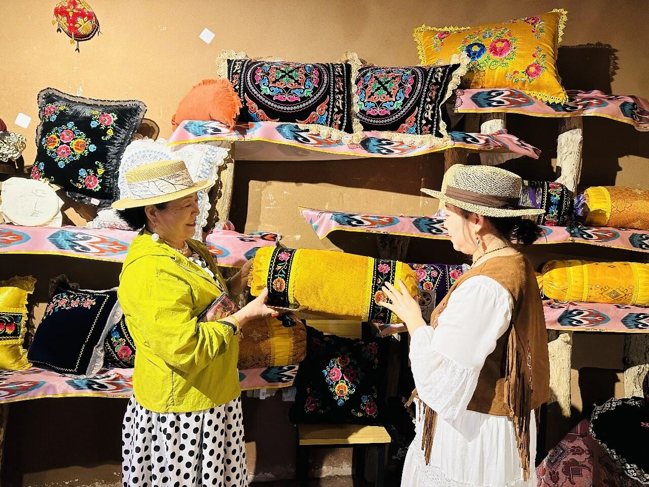 游客在吐峪沟景区非遗文创街区欣赏、选购文创产品。吐鲁番市融媒体中心记者阿地兰摄