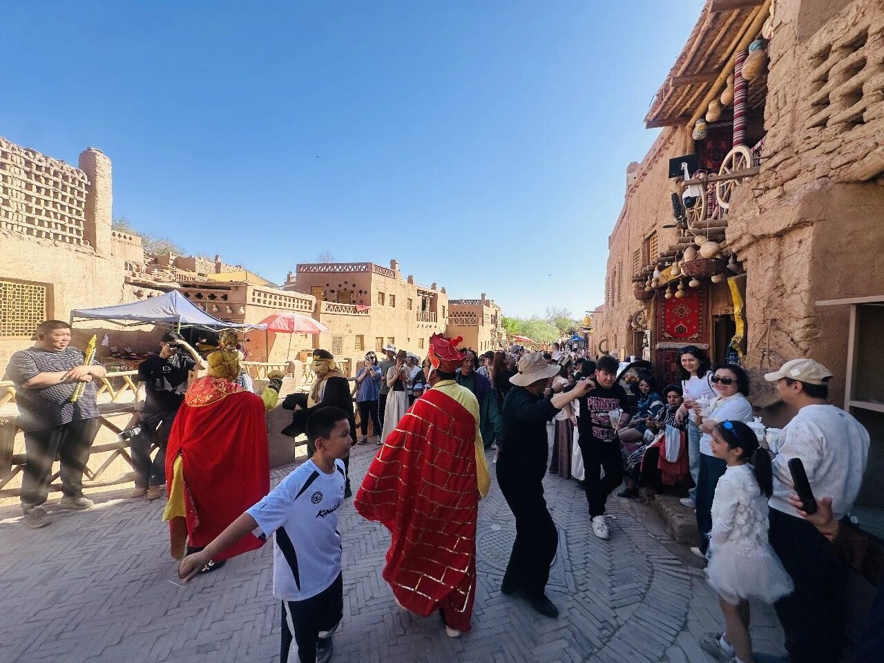 今年清明假期,景区进一步升级文旅体验,推出了沉浸式非遗互动、特色流水席等全新内容,让游客在踏青游玩的同时,近距离感受吐鲁番民俗文化的独特魅力。景区组织的古村巡游活动同样精彩纷呈——身着《西游记》主题服装的NPC与游客热情互动、共舞合影,将节日气氛推向高潮,使游客在沉浸式参与中触摸古村落的历史温度。