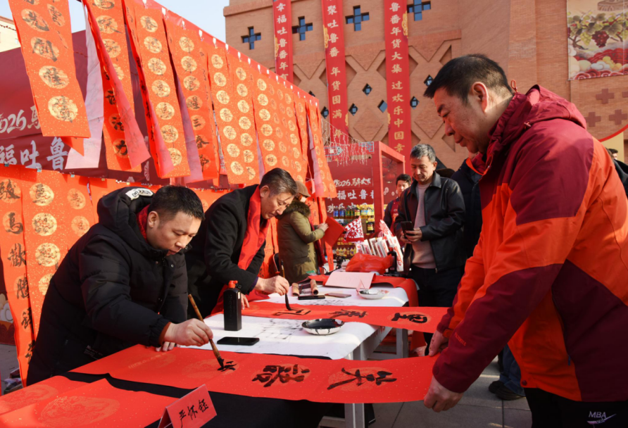 1月31日,“幸福吐鲁番欢乐中国年”2026年货大集火热开市。吐鲁番市高昌区、鄯善县、托克逊县三地联动,共绘一幅热闹欢腾的新春盛景。图为书写春联。吐鲁番市融媒体中心记者刘健摄