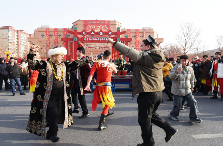 1月31日,“幸福吐鲁番欢乐中国年”2026年货大集火热开市。吐鲁番市高昌区、鄯善县、托克逊县三地联动,共绘一幅热闹欢腾的新春盛景。图为群众跳起麦西来甫。吐鲁番市融媒体中心记者刘健摄