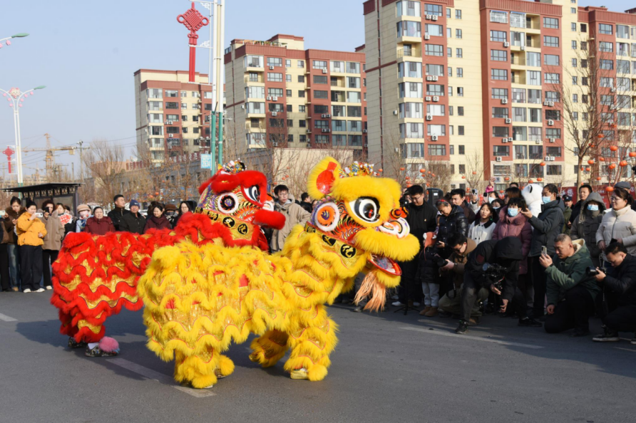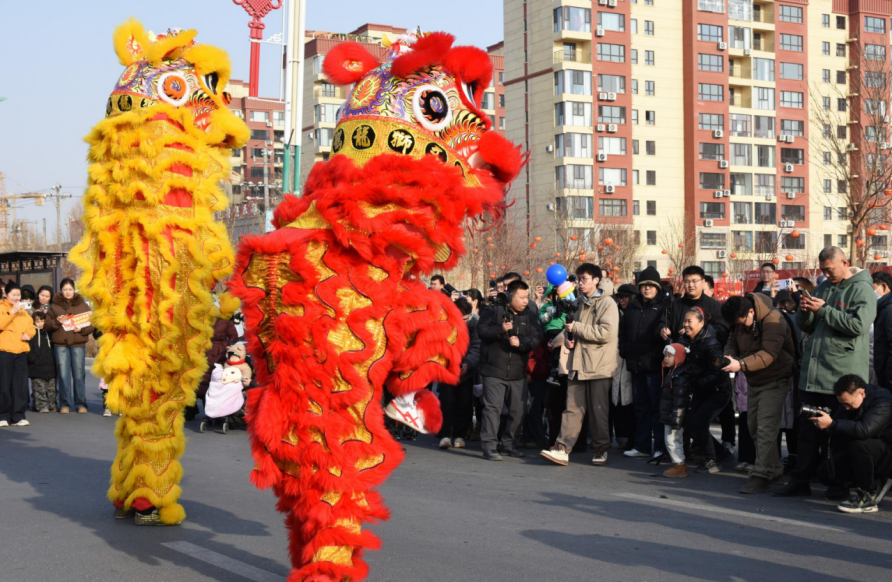 1月31日,“幸福吐鲁番欢乐中国年”2026年货大集火热开市。吐鲁番市高昌区、鄯善县、托克逊县三地联动,共绘一幅热闹欢腾的新春盛景。图为舞狮表演。吐鲁番市融媒体中心记者刘健摄