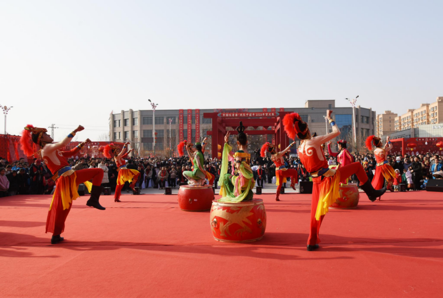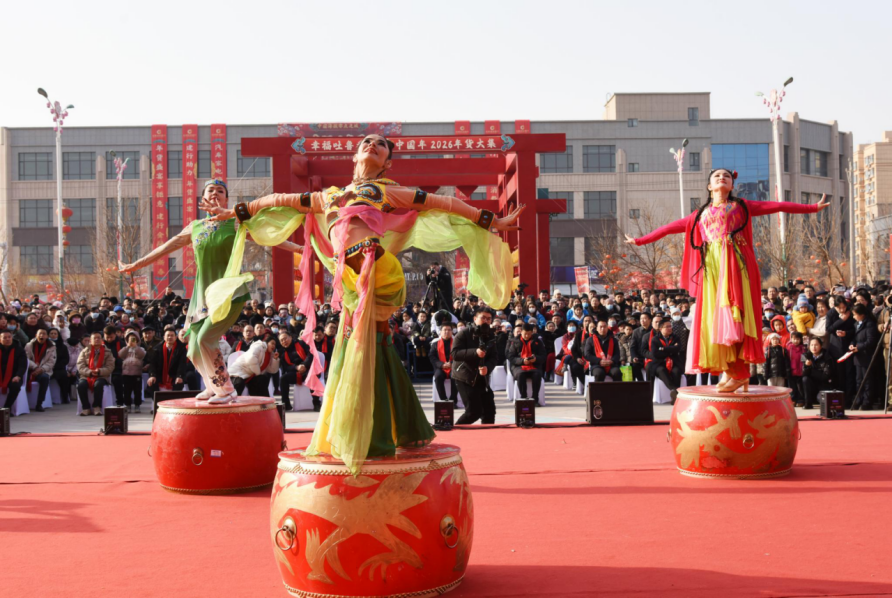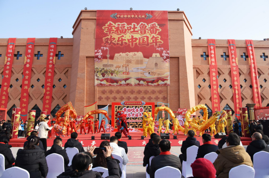 1月31日,“幸福吐鲁番欢乐中国年”2026年货大集火热开市。吐鲁番市高昌区、鄯善县、托克逊县三地联动,共绘一幅热闹欢腾的新春盛景。图为文艺演出现场。吐鲁番市融媒体中心记者刘健摄