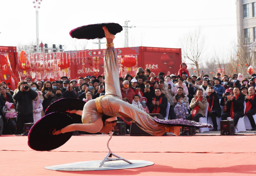 1月31日,“幸福吐鲁番欢乐中国年”2026年货大集火热开市。吐鲁番市高昌区、鄯善县、托克逊县三地联动,共绘一幅热闹欢腾的新春盛景。图为杂技表演。吐鲁番市融媒体中心记者刘健摄