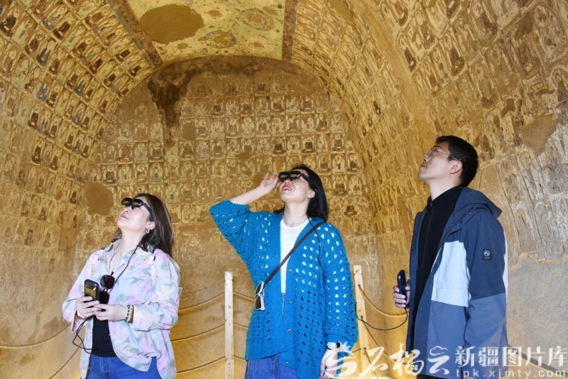 游客通过AR数字技术观赏吐鲁番雅尔湖石窟内精美的壁画(资料图)。刘健摄