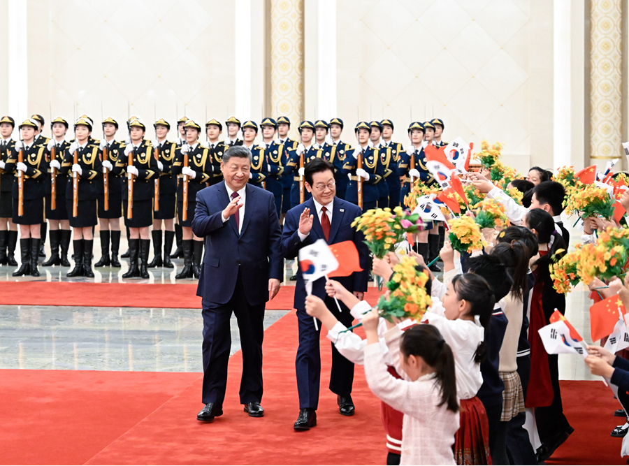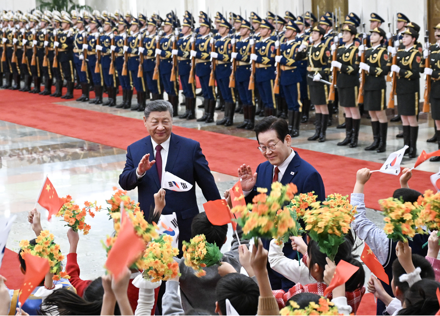 1月5日下午,国家主席习近平在北京人民大会堂同来华进行国事访问的韩国总统李在明举行会谈。这是会谈前,习近平在人民大会堂北大厅为李在明举行欢迎仪式。新华社记者谢环驰摄