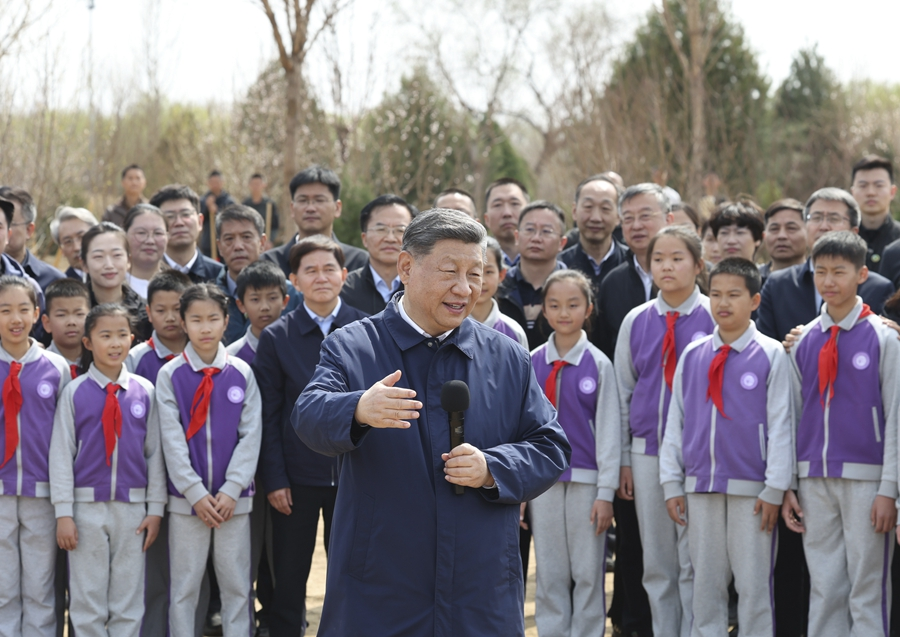 3月30日,党和国家领导人习近平、李强、赵乐际、王沪宁、蔡奇、丁薛祥、李希等来到北京市昌平区百善镇参加首都义务植树活动。这是习近平同在场的干部群众、少先队员亲切交谈。新华社记者燕雁摄